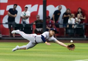 Sep 7, 2025; Phoenix, Arizona, USA; Boston Red Sox outfielder Rob Refsnyder attempts to make a diving catch in the sixth inning against the Arizona Diamondbacks at Chase Field. Mandatory Credit: Mark J. Rebilas-Imagn Images
