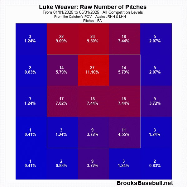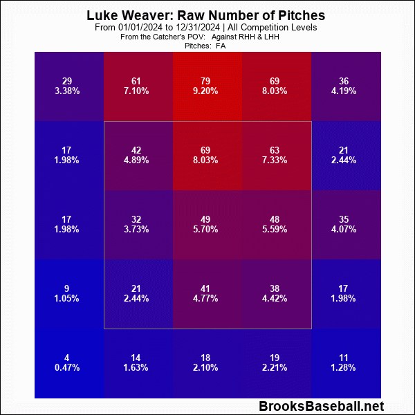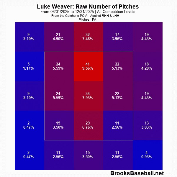 The velocity loss is notable, as is the reduced cutter usage, but more than anything Weaver’s fastball command is what undermined him in 2025. For reference, here’s where Weaver through his fastball in 2024: