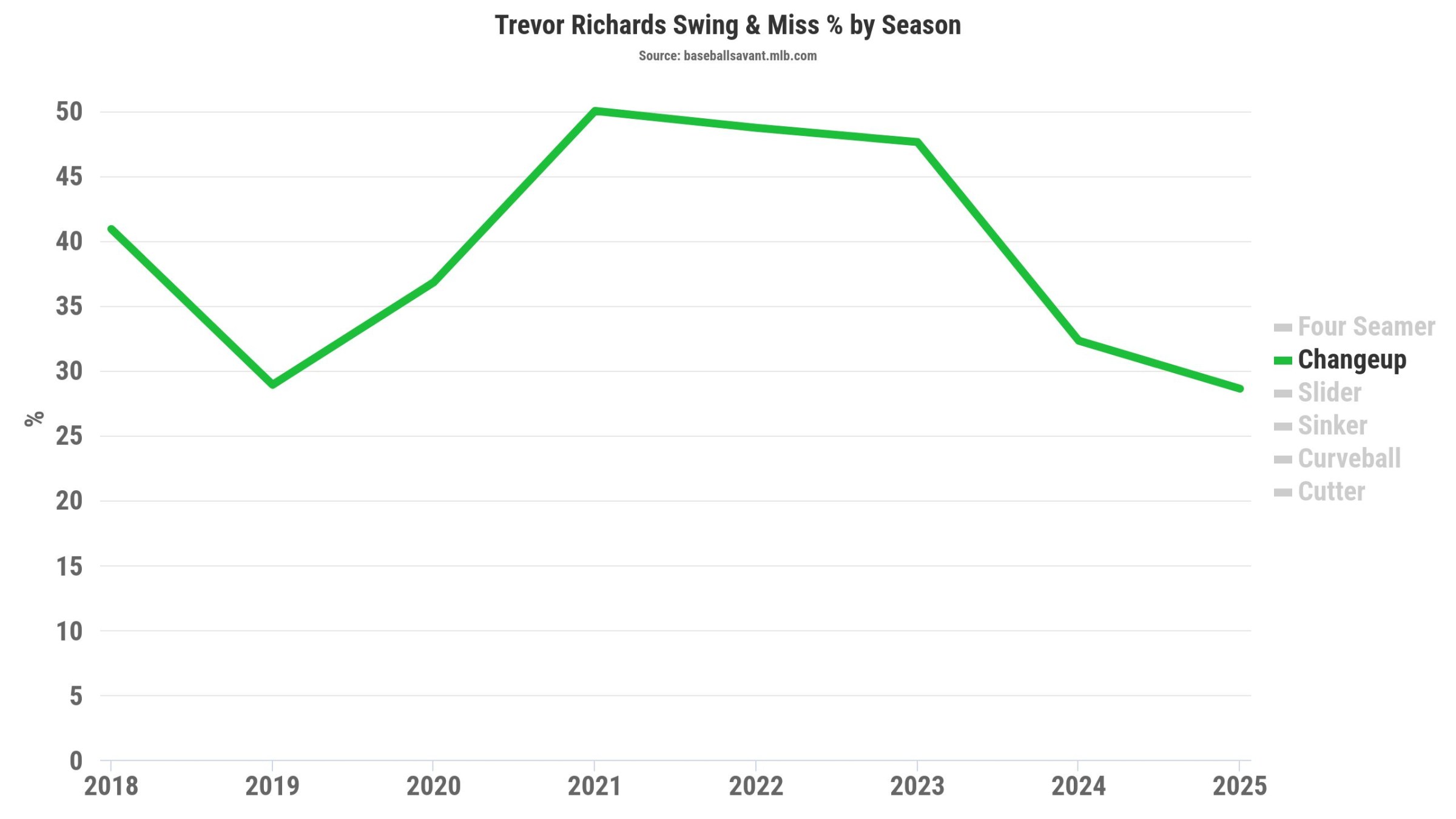 The key is going to be getting this changeup back to where it was. The whiff rates he was getting on the pitch were excellent in 2021-23 until it started falling off a cliff.
