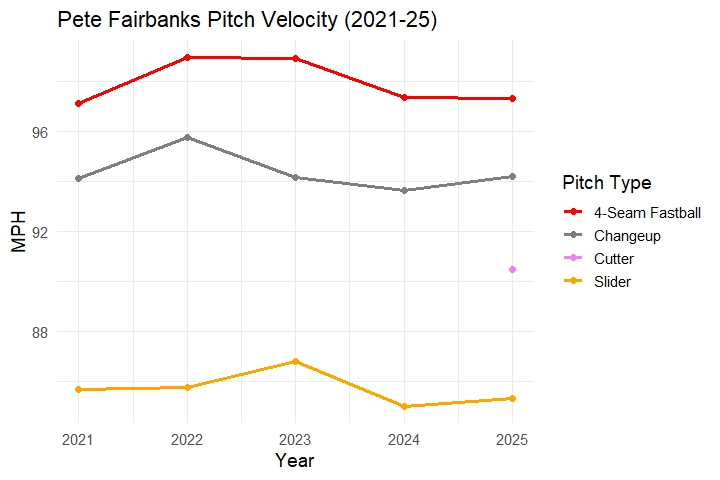 Fairbanks’ fastball velocity has remained high over the years, albeit not as high as it was. Just three years ago, in 2022, Fairbanks averaged 99 MPH on the fastball. This past season, it was 97.3%.