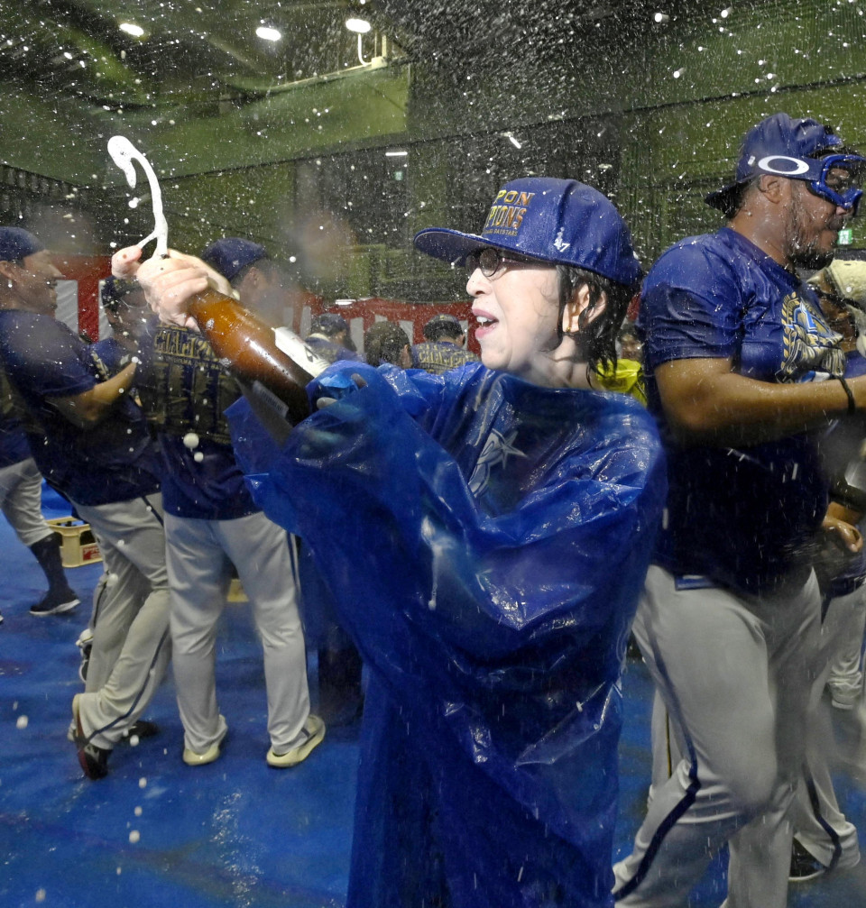 DeNA BayStars owner Tomoko Namba takes part in a “beer fight” after the baseball club’s Japan Series victory in Yokohama on Nov. 3, 2024. (Kyodo)