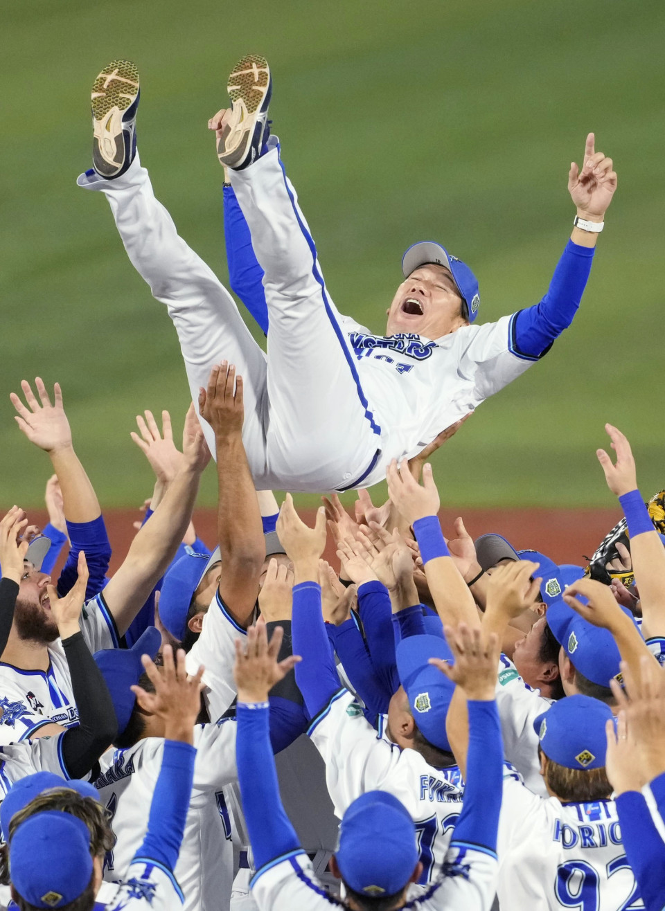 DeNA BayStars manager Daisuke Miura is tossed into the air by his players after they clinched their first Japan Series baseball title since 1998 with an 11-2 victory over the SoftBank Hawks in Game 6 on Nov. 3, 2024, at Yokohama Stadium in Yokohama, near Tokyo. (Kyodo) ==Kyodo