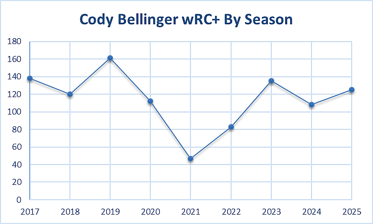 Trent Grisham’s Steamer projection improved from a 106 wRC+ to a 110 after he was re-signed, so I’d expect Bellinger to push to around the 120 wRC+ mark for the 2026 season.