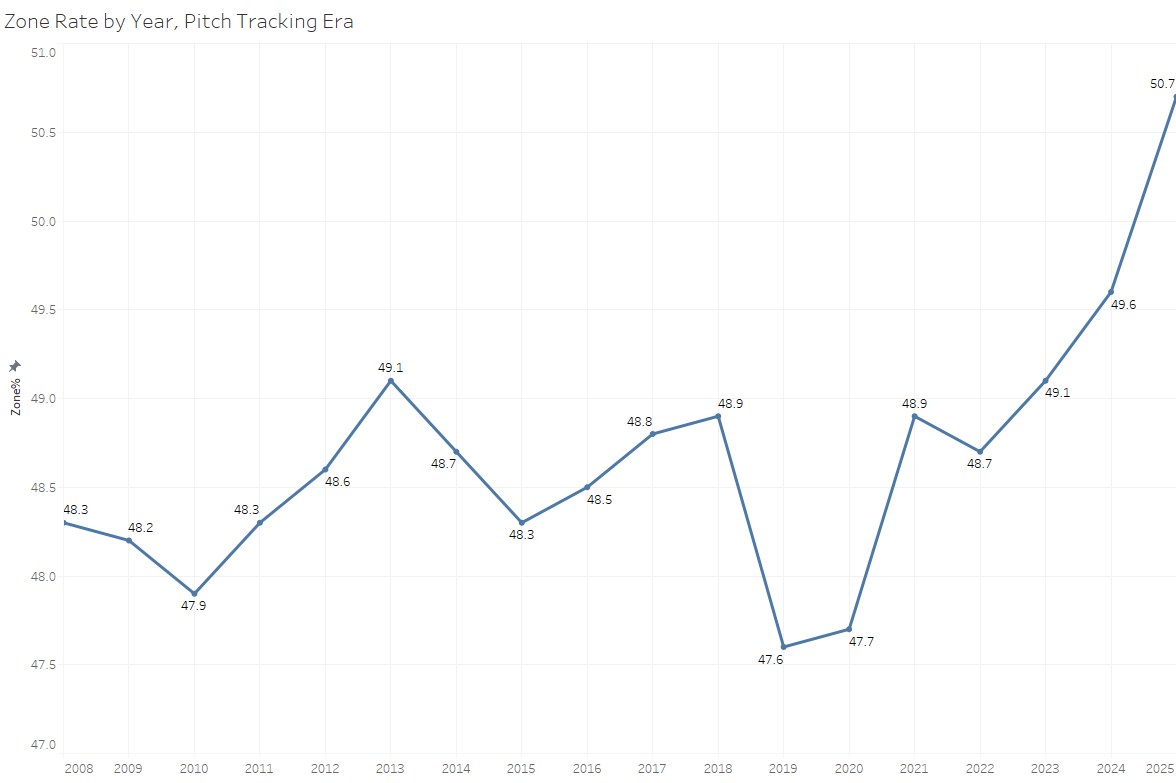 Stumbling through statistics after the Red Sox season ended, I noticed an interesting trend. Since pitch tracking was introduced in 2008, 2025 was the first season during which more than half of all pitches thrown were in the strike zone. The number has slowly been on the rise over the past several seasons, and 2025 was the first time it eclipsed the 50% mark.