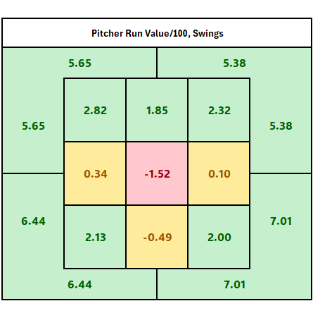 While the increase might seem small, with upwards of 700,000 pitches thrown across the league in a given season, the shift is clearly intentional. But why? Well, because hitting is hard. Here’s a look at pitcher run values per 100 pitches on swings, sorted by zone.