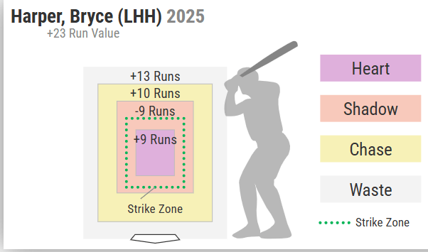 Harper has always been aggressive at the plate, so this isn’t really surprising. What is a bit surprising is that when Harper is getting pitches in the middle of the plate, he’s not producing as much as one would like.