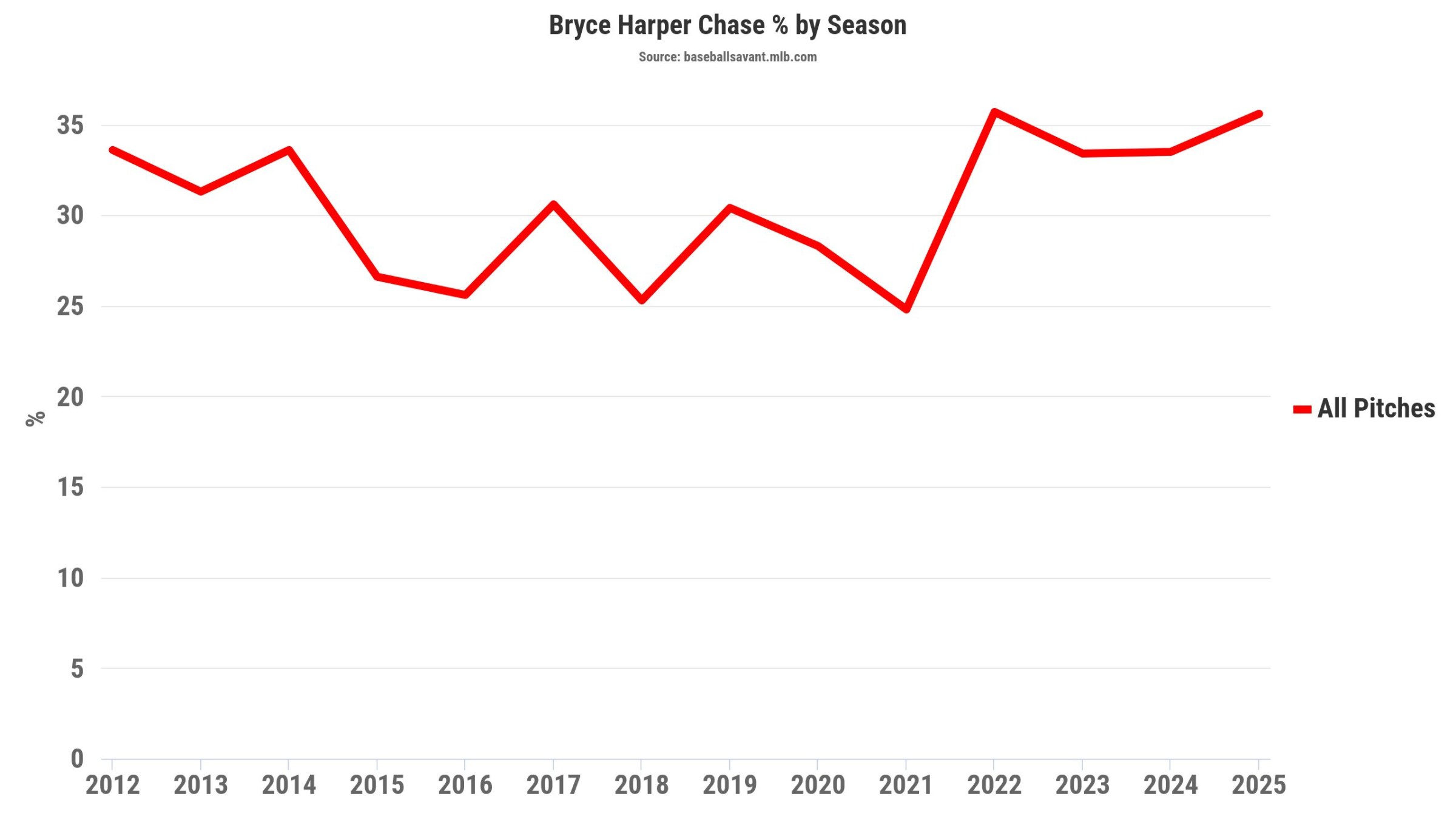 Some of the trends that one does not wish to see happen to a player are happening with Harper. He’s starting to chase more and more when he’s at the plate.