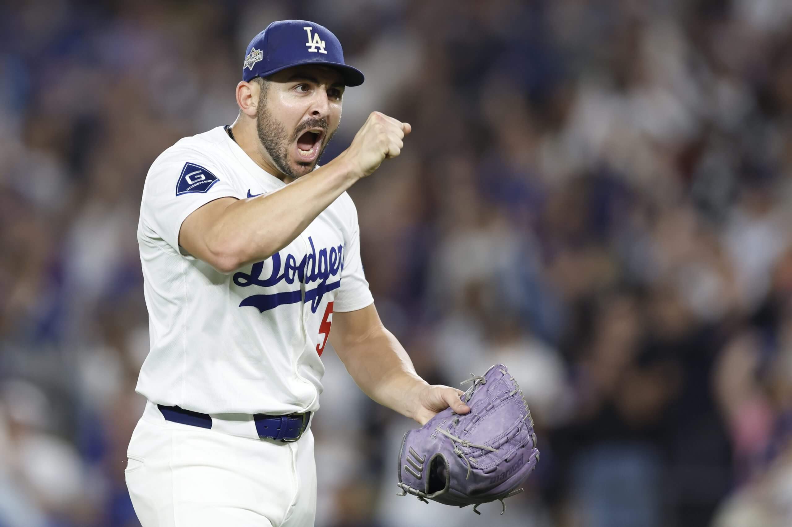 Alex Vesia recorded a one-pitch strikeout for the ages in the Wild Card Series. (Ronald Martinez / Getty Images)