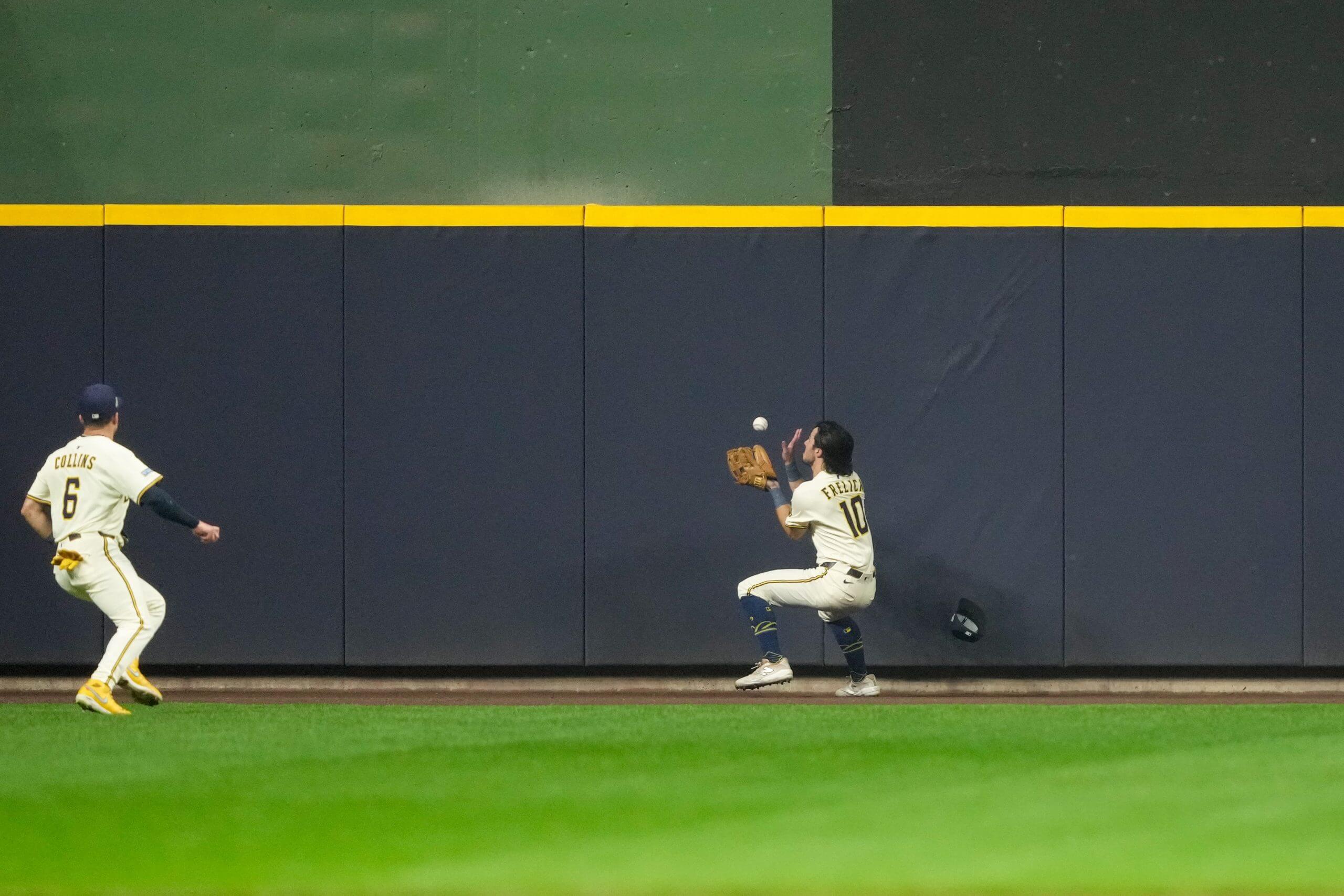 After rising to almost catch Max Muncy’s 404-foot blast, Sal Frelick plays the ball off the wall in NLCS Game 1, triggering one of the most unusual double plays ever. (Aaron Gash / MLB Photos via Getty Images)