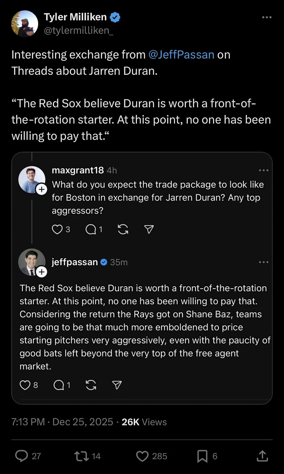 That doesn’t really leave room for a Bellinger (expected AAV $28 million), Bregman ($31 million), Tucker ($36 million), or even Suárez ($21 million) level free agent without either committing to the second threshold for 2026 or cutting payroll somewhere else. Which kind of brings us to Jarren Duran.