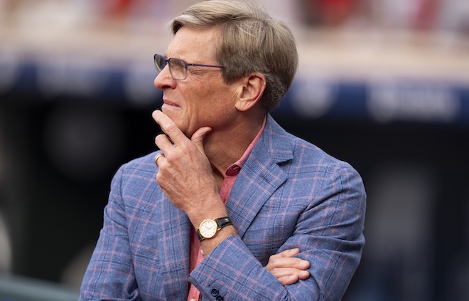 Philadelphia Phillies owner John Middleton looks on at the Phillies Wall of Fame ceremony prior to a baseball game against the Detroit Tigers, Friday, August 1, 2025, in Philadelphia. (AP Photo/Chris Szagola).