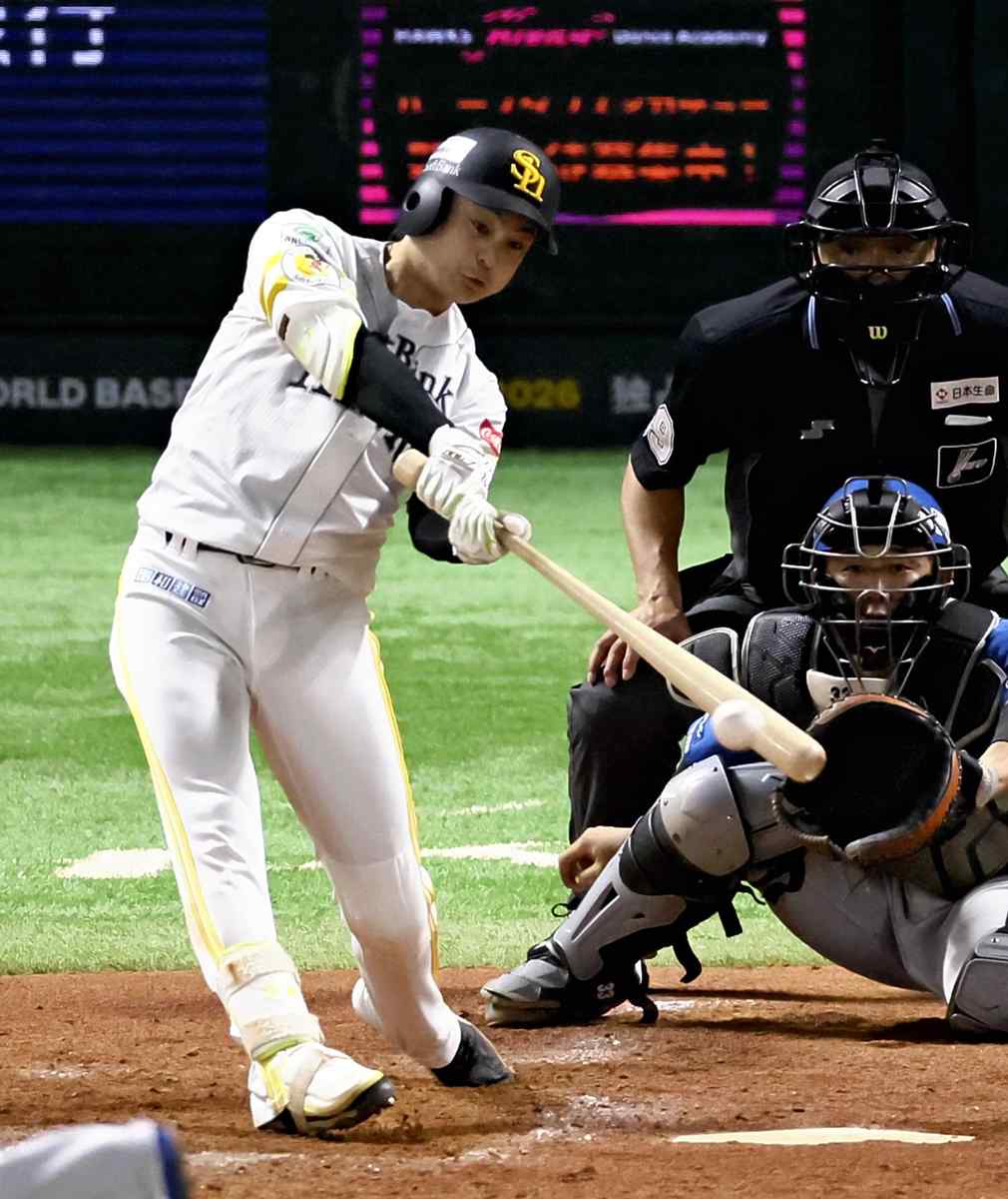 SoftBank Hawks’ Hikaru Kawase bats in a game against the Hokkaido Nippon-Ham Fighters at the Mizuho PayPay Dome Fukuoka in Chuo Ward, Fukuoka, on Monday.
