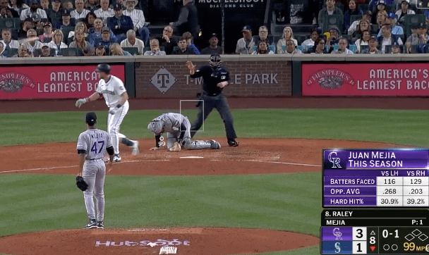 But Raley the Unicorn is just as likely to get on base like a slap-hitting infielder. He’ll drop a bunt down and use his surprising speed to leg out an infield base hit. He’s even likelier to wear a pitch, in the vein of the player the Mariners traded to the Rays for Raley, utilityman José Caballero. Here he makes no effort to get out of the way of 99 mph from the Rockies’ Angel Mejia. Raley walks away unscathed; the catcher is not so lucky.
