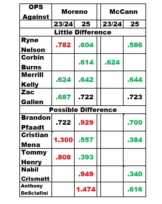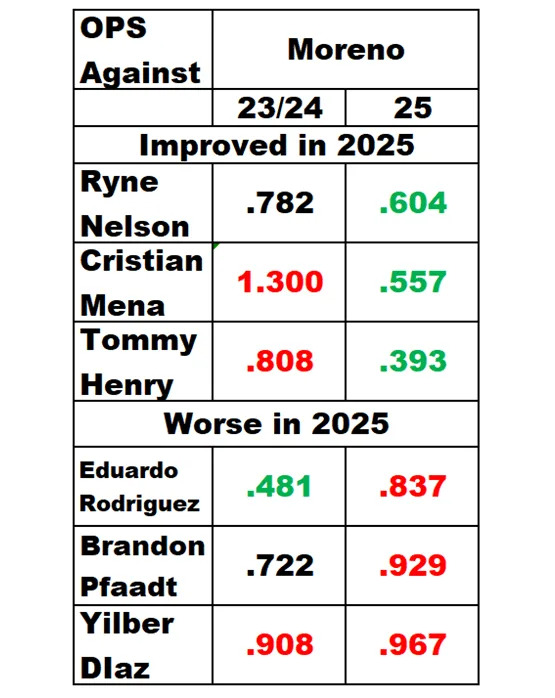 The following table shows that in 2025, with Moreno catching, three pitchers improved their OPS against, while three pitchers worsened their OPS against. That did not count Kelly and Gallen, who are now free agents, and were not much changed in 2025. In 2025, league average OPS was .719. Data from Baseball Reference.
