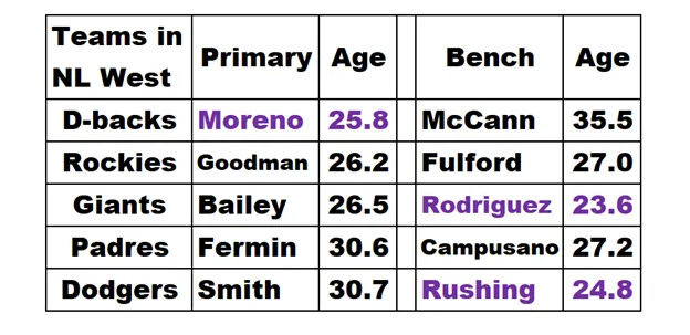 Moreno is the youngest primary catcher in the NL West. His youth adds luster to the Diamondbacks outlook beyond next season. The following table shows the ages of catchers per FanGraphs Roster Resource.