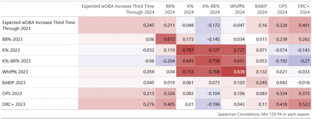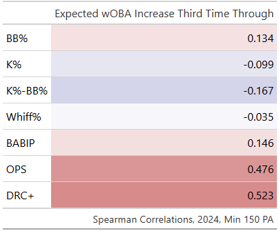 We also see extremely strong correlation between TTOP skill and OPS and DRC+. Some of the correlation between overall outcomes and TTOP skill is tautological: if you improve a lot the third time through the order then of course it’s going to increase your OPS, and thus of course it’s going to result in a positive correlation. However, when we look at how well a stat in one season predicts TTOP skill in the next we again see OPS and DRC+ near the top, and the plate-discipline numbers losing some explanatory power.