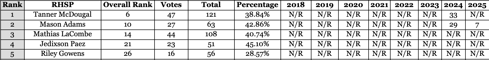 Here is how 2018 wrangled out — all 42 picks. Also, here is an archive of every article in the 2018 series.Here is how 2019 came together, all 50 picks, and the archive as well.Now 2020, with the archive.Here is the 2021 wrap-up of just 35 picks due to flagging participation, along with the full archive.Here is the 2022 link to the 27-pick wrap, along with the full archive.Round 24 of voting was the last of 2023 (we did not do an actual wrap for the voting, but Jordan Sprinkle ended up being our final pick), and the full archive.In 2024 Abraham Núñez was our 34th pick to end the series, and here is the wrap-up post and full archive of each profile.And last year, we did 31 picks, ending with Eric Adler. Here is the wrap and full stream, of every article.