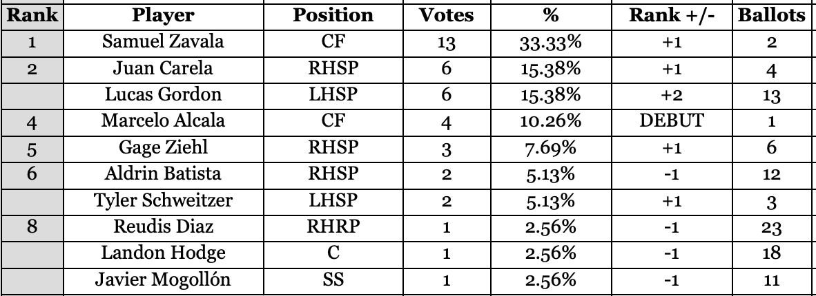 Newcomer Marcelo Alcala — another center fielder — made an impressive ballot debut, earning four votes and finishing fourth. On this new ballot, oft-injured but still a top prospect in many eyes Alexander Albertus joins the fun.
