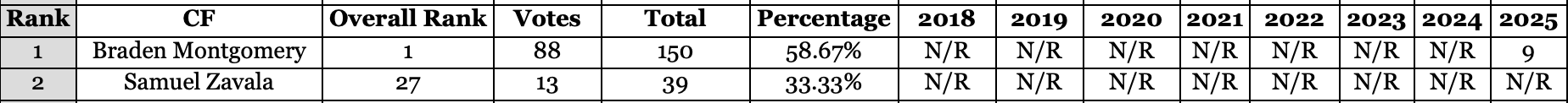 This marks Zavala’s very first time in our Prospect Vote, having joined the organization in 2024 but never quite reaching the ballot.