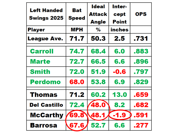 The following chart looks at left-handed swings for some possible 2026 batters. First it shows league averages. Then, with names in green font, it shows players with above average OPS. Then it shows the other players, with weaknesses circled.