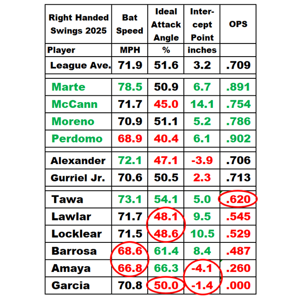 The following chart looks at right-handed swings for some possible 2026 batters. First it shows league averages. Then, with names in green font, it shows players with above average OPS. Then it shows players with near-average OPS. Then it shows the other players, with weaknesses circled.