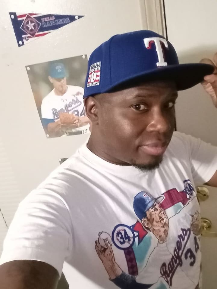 This hat is my latest one as of August 2025. A navy blue hat with the Rangers logo and on the right, a National Baseball Hall of Fame patch is displayed. As you can see in this photo, I’m posing, wearing my hat, a Nolan Ryan shirt, and in front of pictures of the legendary pitcher. My goal is to buy a throwback 90s Pudge RodrÃguez Texas Rangers jersey. One in either white or grey with Rangers in red letters. Him and Nolan are both inducted into the Baseball Hall of Fame, so that’s the main reason why I bought this hat.