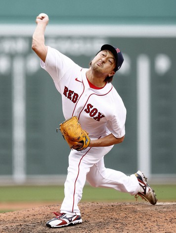 This file photo taken in April 2021 shows Hirokazu Sawamura pitching for the Boston Red Sox against the Baltimore Orioles during the ninth inning on Opening Day at Fenway Park in Boston. (Getty/Kyodo)