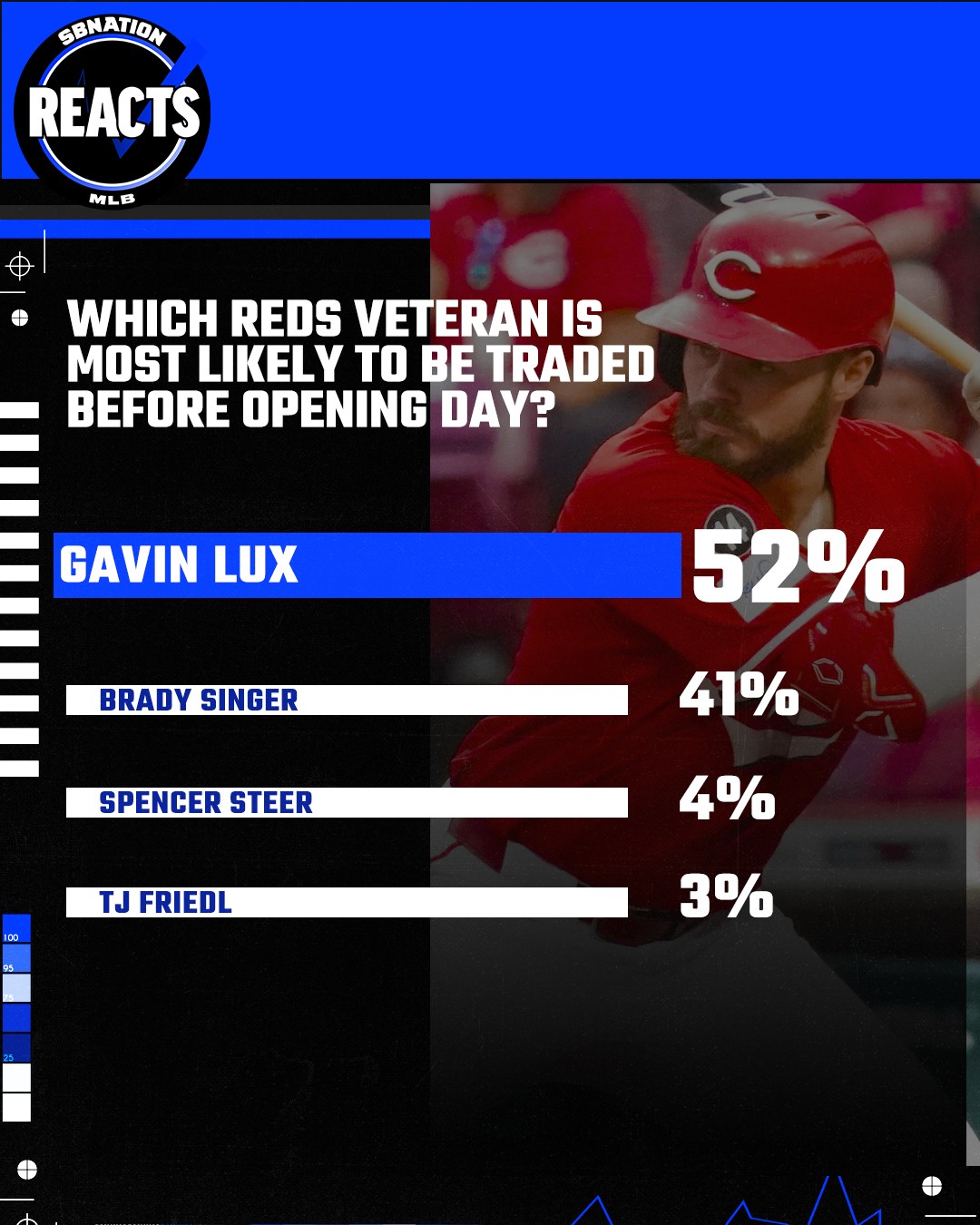 Perhaps it was that dwindling team control. Perhaps it was the $5.525 million he’ll now earn despite posting a -0.2 bWAR season in 2025 in 503 PA and still not really having a position to play. Either way, he earned the most support among you, the voters, in this week’s MLB Reacts survey that asked which among Lux, Brady Singer, Spencer Steer, or TJ Friedl was most likely to be traded away before Opening Day.
