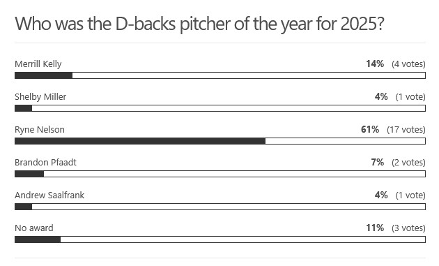 That’s decisive, with Nelson getting a clear majority of all the votes, and no particular stand-out as a runner-up. Everyone got at least one vote, and I do note that ‘No award’ got several, which perhaps indicates the fanbase being fed-up of the Diamondbacks’ pitching and their faffing around. If this does prove to be the last hurrah for both Mike Hazen and Torey Lovullo, it’s likely no exaggeration to say the cause of their eventual demise could be found on the mound at Chase Field. But last year, Ryne was certainly less of the problem, and hopefully will be more of the solution too, going forward. Let’s just hold off on any contract extension, m’kay?