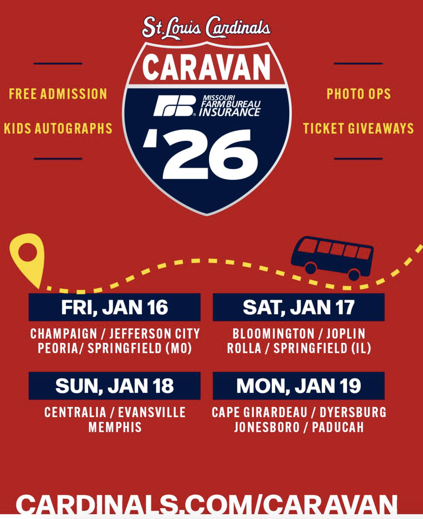 The Cardinals Caravan will travel to 15 different cities across Missouri, Illinois, Tennessee, Arkansas, Kentucky and Indiana over the course of four days. A combination of more than 30 current Cardinals players, prospects, alumni and team broadcasters will embark on one of five different caravans through Cardinal Nation from January 16-19.