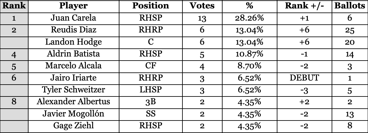 The story of this ballot was the massive jump that the two old heads on the ballot took, as Reudis Diaz and Landon Hodge both moved from a tie for eighth place to a tie for second. Newcomer Jairo Iriarte made an impressive debut, earning three votes and a tie for sixth place. Righty starter Yobal Rodriguez gets into the action this round.