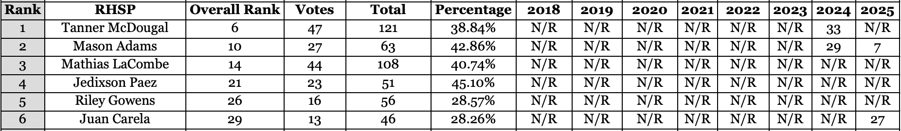 Here is how 2018 wrangled out — all 42 picks. Also, here is an archive of every article in the 2018 series.Here is how 2019 came together, all 50 picks, and the archive as well.Now 2020, with the archive.Here is the 2021 wrap-up of just 35 picks due to flagging participation, along with the full archive.Here is the 2022 link to the 27-pick wrap, along with the full archive.Round 24 of voting was the last of 2023 (we did not do an actual wrap for the voting, but Jordan Sprinkle ended up being our final pick), and the full archive.In 2024 Abraham Núñez was our 34th pick to end the series, and here is the wrap-up post and full archive of each profile.And last year, we did 31 picks, ending with Eric Adler. Here is the wrap and full stream, of every article.