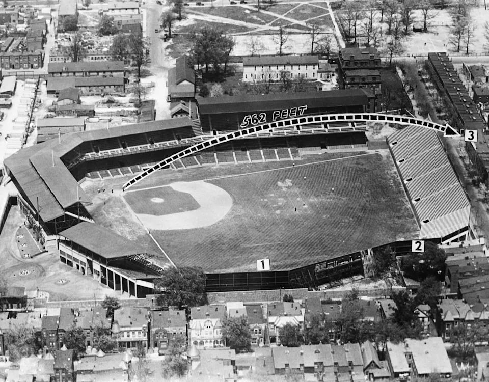 1953 also brought scarce playing time, though he did manage a pair of home runs in five appearances. However, it did include Babe’s involvement in one of the keystone moments in Yankees folklore. It was April 17, 1953, a blustery day at the Senators’ Griffith Stadium in Washington, DC, gusts howling out to left-center. Mickey Mantle was about to step to the plate for his fifth-inning AB against right-handed pitcher Chuck Stobbs, but couldn’t find his bat, so at the last second he borrowed Babe’s lumber. He crushed a pitch to left — so hard that part of the cover came off — the ball soaring over the left field wall and Fifth Street beyond the stadium before coming to rest in the backyard of 432 Oakdale Street.
