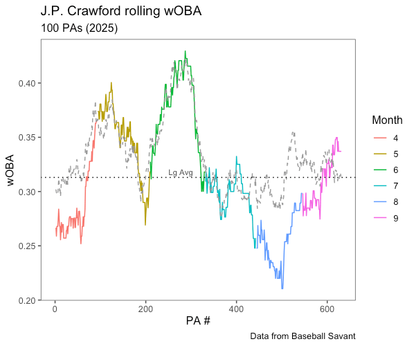 The Mariners are celebrating their 50th season in 2026. They’re asking you to remember some guys. I’ve been thinking about what Crawford’s legacy with org will be, if this is truly the beginning of his final chapter. He’s 10th all time in plate appearances in Seattle, needing 610 to pass Raul Ibanez for ninth. He’s 13th in fWAR, needing 3 1/2 to climb into the top 10 over Bret Boone, Mike Cameron and Robinson Canó. In other words, Crawford is not an inner circle Mariners’ legend, but he’s firmly established himself as one of the Next Best.
