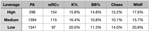 Fangraphs splits leverage into three categories: low, medium and high. “Leverage” is determined by a rather complicated formula that captures what’s at stake in at bat, given the inning, score, situation, etc. Basically, it’s a measure of how “crucial” the at bat is to the outcome of the game.
