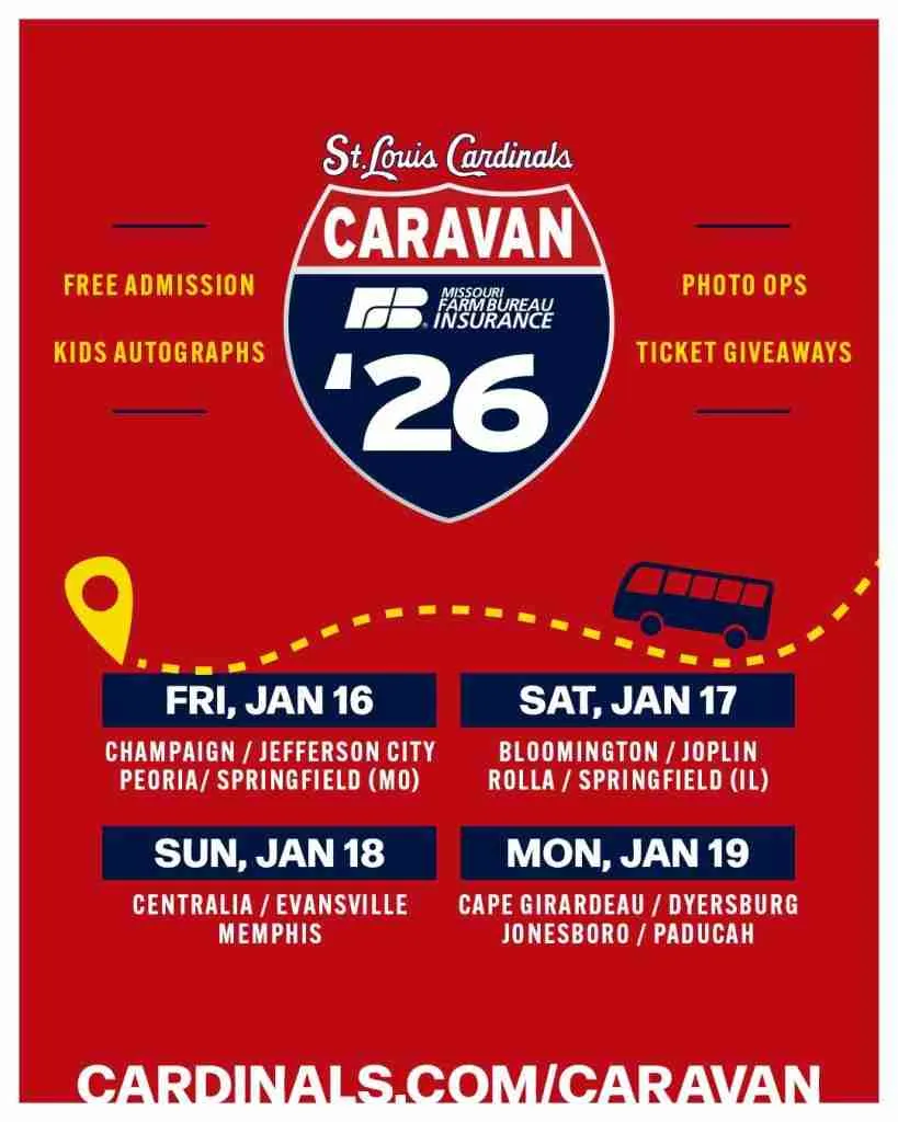 This year’s caravan will feature active players Riley O’Brien and Gordon Graceffo, alumni Matt Adams and Alan Benes, minor league prospects Liam Doyle and Blaze Jordan, and announcer Matt Pauley.