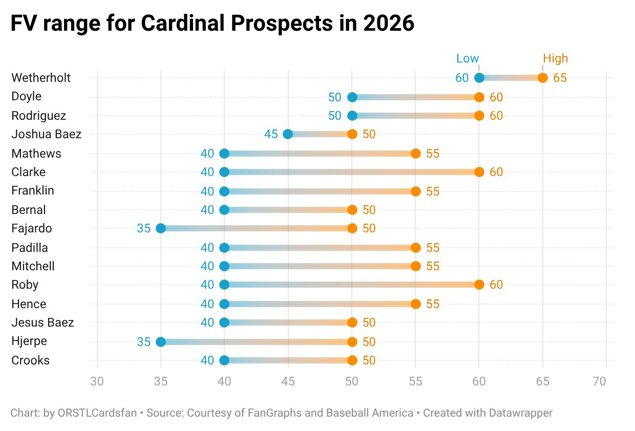 BA tries to handicap each individual players’ future contribution. I can see it, but I’m sure I totally buy it. Wetherholt has a 65 FV, with a “mild” risk, which adjusts his scouting grade to 60. I think it is reasonable to view him as 65 FV prospect, but he may not produce in the MLB to the level expected of a 65 FV player. It could just as well be 40 or 50 or 70 level performance, and most likely will NOT be the risk-adjusted value of 60 (just going with the odds). But I appreciate the range, which I find more satisfying than a single number. I don’t think prospects are easily quantified into a single number. I can take the FG score for Wetherholt (55, low risk) and blend it with the BA score (65, mild risk) and find a range (55-65) and recognize that his MiLB performance has narrowed the expected range but hasn’t eliminated the risk factor entirely. Here is a table showing the top prospects in the Cardinal system by range of FV (risk is not shown, but generally the wider the range, the greater the risk projection):
