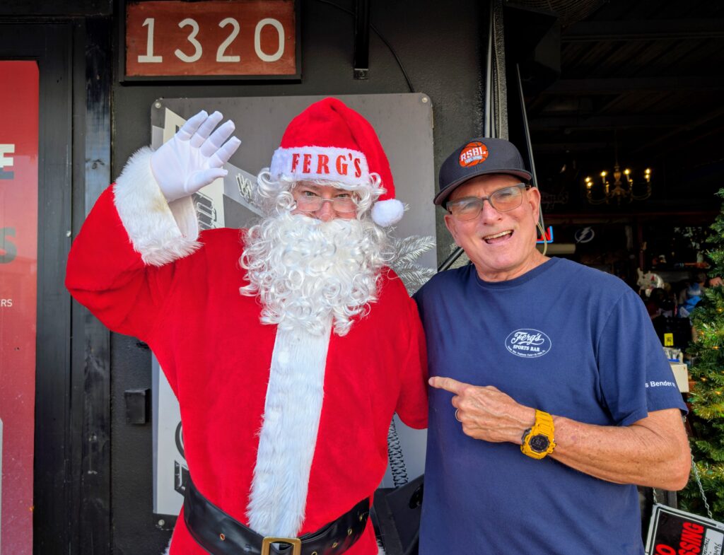 Neil MacDonald (left) transitioned from Fan Man to Santa Claus – and decorated and donated “Charlie Brown Christmas trees” – around the holidays. Mark Ferguson, owner of Ferg’s Sports Bar and Grill, credited his ability to connect with customers. Photo by Mark Parker.