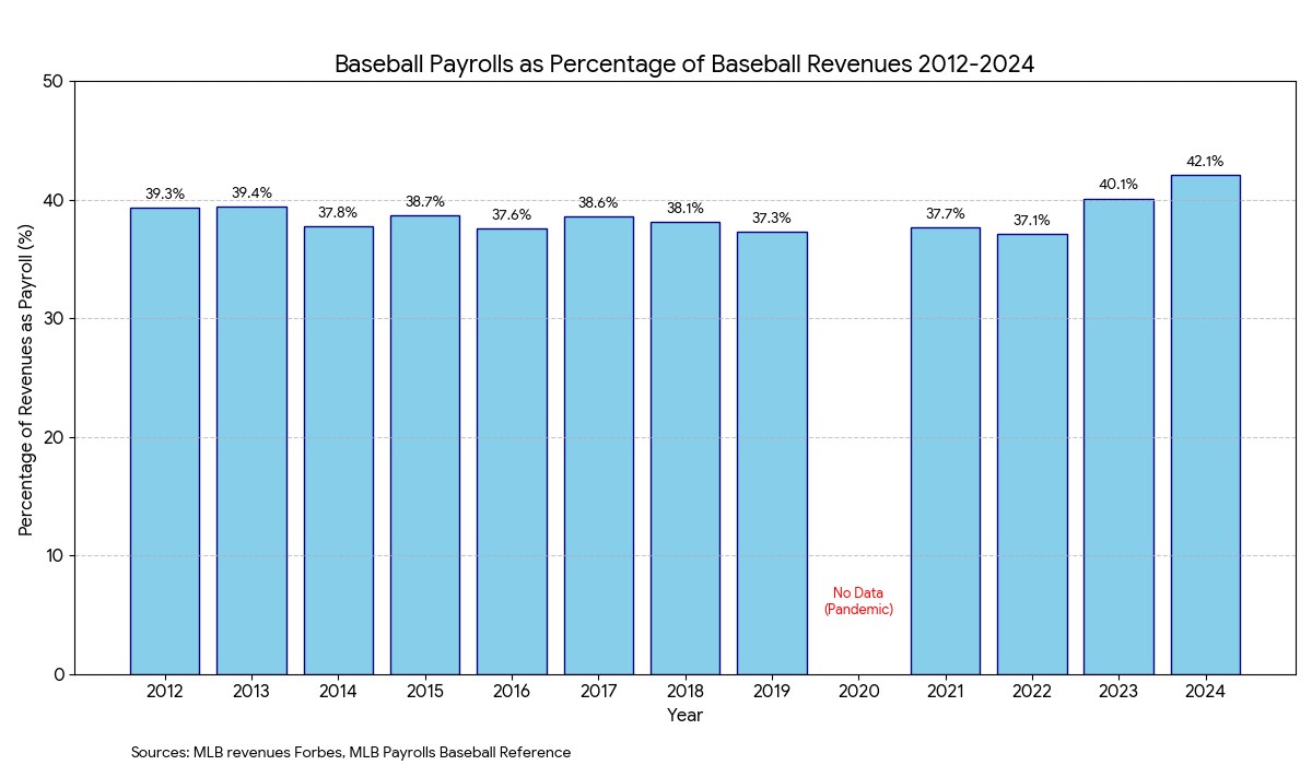 MLB is nowhere near that. In fact, in 2024 MLB salaries were 42.1% of revenues. That is the highest percentage for players over the past 12 non-pandemic seasons, ranging from 2012 to 2024.