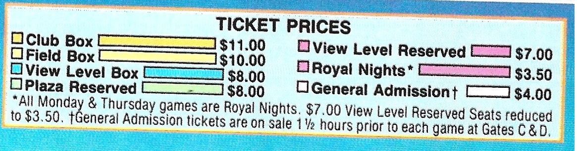 Here are Royals ticket prices from the 1990 team yearbook.