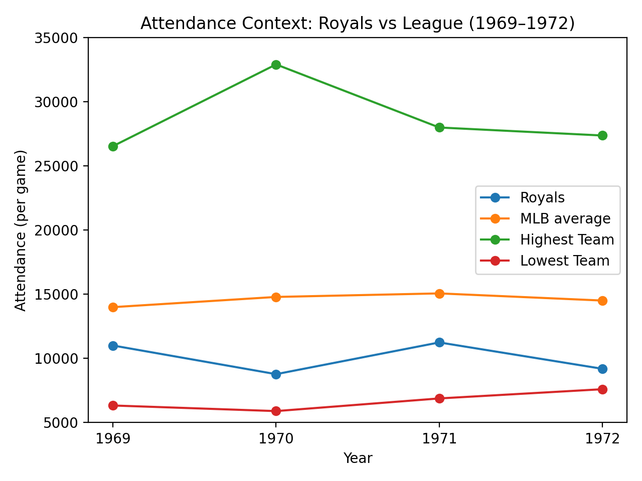 The Royals finished 15th out of 24 clubs in per-game attendance, playing games in old Municipal Stadium at 22nd and Brooklyn. Just 17,688 fans came out on a cold and windy night to the first game in club history, half the stadium capacity of 34,164. They finished with the third-worst attendance in baseball the next year, but had a mild attendance bump by 1971 during the team’s first winning season. That didn’t carry over to 1972, as the Royals were one of eight clubs to draw fewer than 10,000 fans per game.