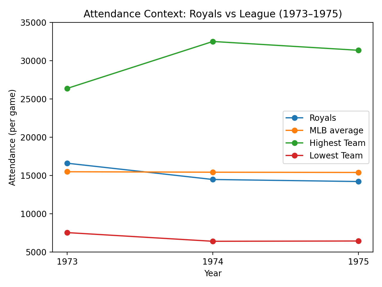 The Royals enjoyed a pretty significant attendance bump after moving into brand new Royals Stadium, finishing tenth among all clubs in attendance in 1973, drawing more fans to the gate than the Yankees or either of the first-place AL clubs – the Orioles and Athletics. Attendance fell slightly the next two years as the team had a losing record in 1974, but bounced back with a then-club record 91 wins in 1975.