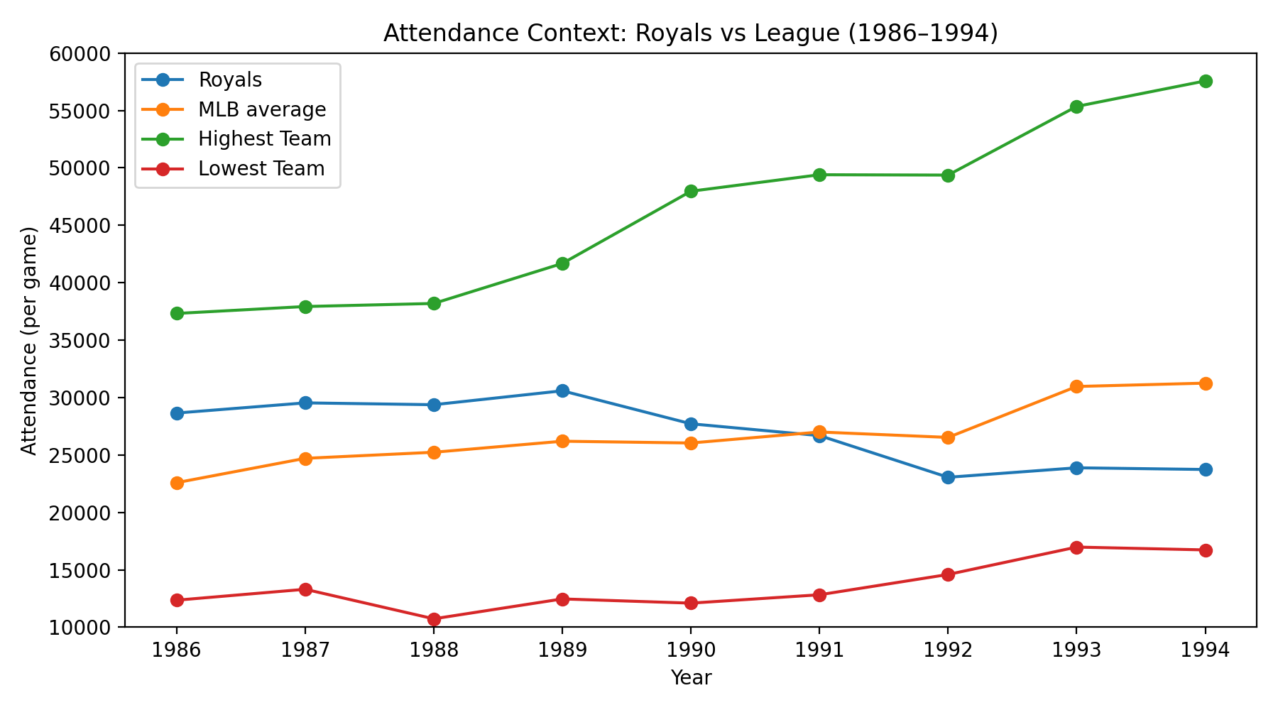 MLB attendance really began to take off in the mid-80s, going from 22,589 fans per game league-wide when the Royals won the 1985 title to 31,256 fans per-game when the players went on strike in 1994. New stadiums brought large new crowds in Baltimore, Cleveland, Texas, and Toronto, and new expansion teams in Colorado and Florida initially drew massive crowds in temporary homes in NFL stadiums.