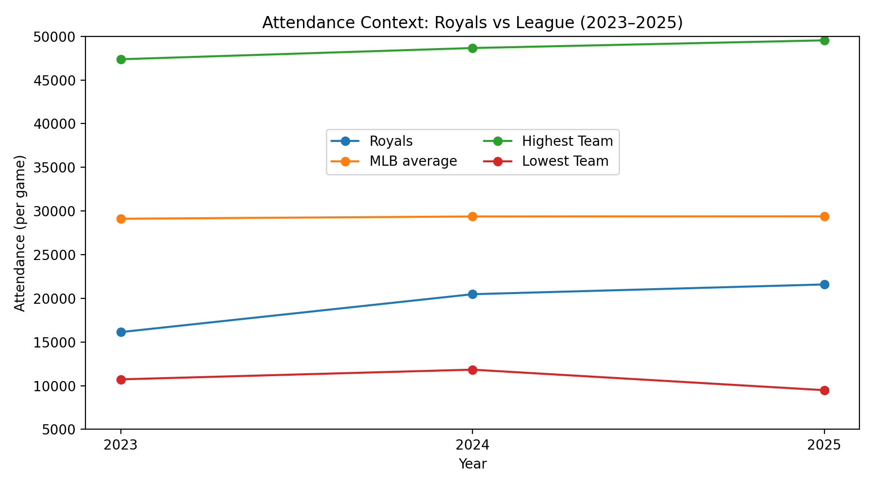After years of rebuilding after the championship core departed after 2017, the Royals began to build attendance back up once J.J. Picollo took over in 2023. A playoff run in 2024 boosted attendance, and that increase continued to 2025 when the team drew 21,590 fans per game, their best numbers since 2017.