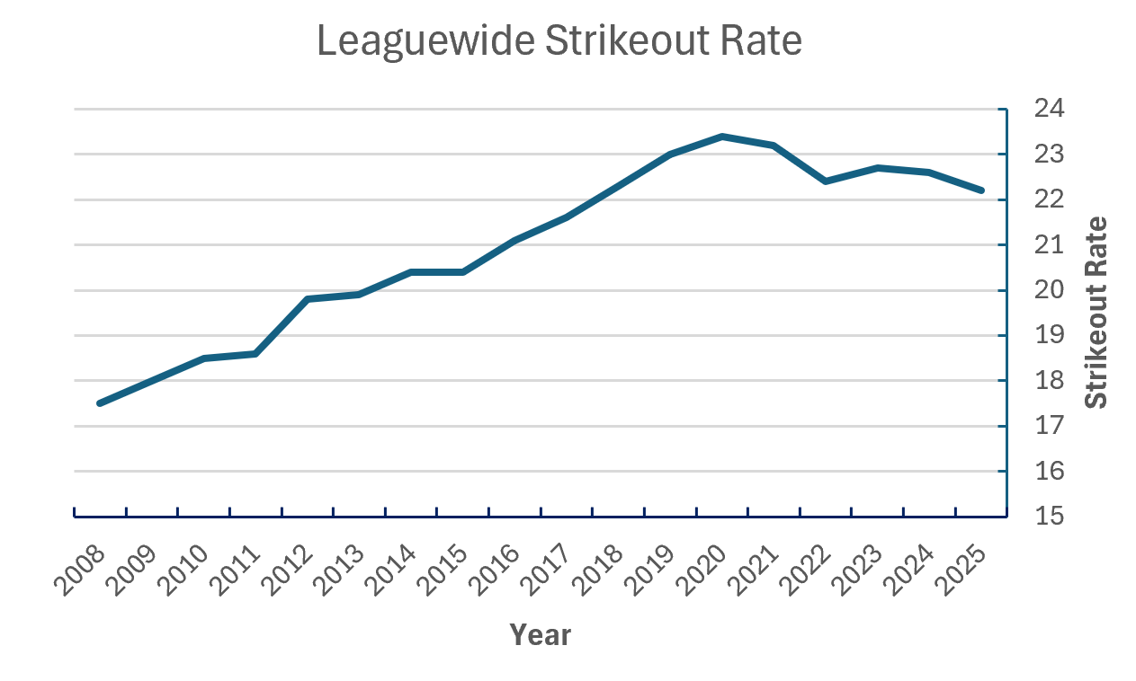 Obviously the league has quite a ways to return to a strikeout rate in the teens like we saw for most of the 2000s and into the 2010s. Teams are already combating the declining effectiveness of fastballs by simply throwing them less, particularly for pitchers who don’t have a particularly good heater. Honestly, the odds are it never will drop fully without further rules changes in order to force hitters to re-emphasize a contact approach. However, simply staving off the climb of the early 2020s has been a pleasant surprise. Any continued drop would be a nice bonus and something to keep an eye on in 2026.