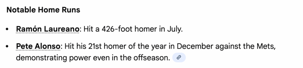(An aside: AI is proving to be wildly inaccurate when it comes to baseball stats. Google AI reported the following on Orioles homers in 2025: