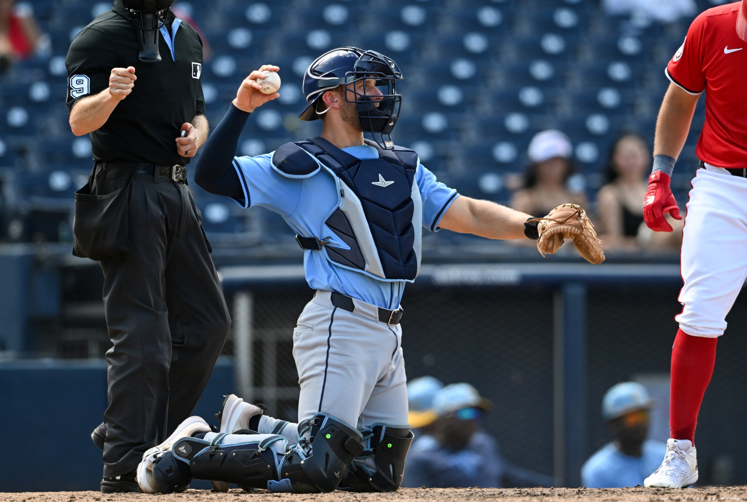 WEST PALM BEACH, FLORIDA – MARCH 16, 2025: Kenny Piper #76 of the Tampa Bay Rays throws to the pitcher during the ninth inning of a spring training game against the Washington Nationals at CACTI Park of the Palm Beaches on March 16, 2025 in West Palm Beach, Florida. (Photo by Nick Cammett/Diamond Images via Getty Images) Diamond Images/Getty Images