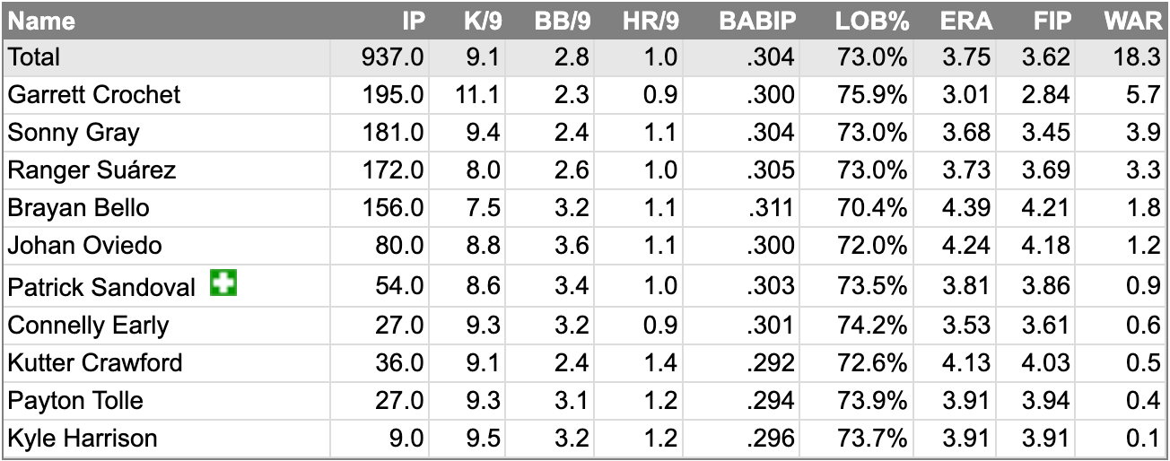 Starters who made 30 starts: 2Starters who made 20 starts: 5Starters who made 10 starts: 6Total starters: 10