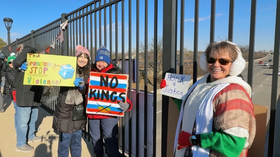 Community members lined the Tamm Avenue overpass Tuesday protesting President Trump and his administration.