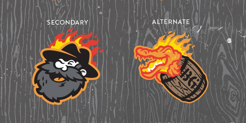 The identity centers around an updated version of a bearded bootlegger character who is wielding a baseball bat and riding a flaming bourbon barrel. An alternate mark features a flaming alligator in a barrel, a reference to the process of treating the inside of bourbon barrels with flames, which creates an “alligator char” pattern.